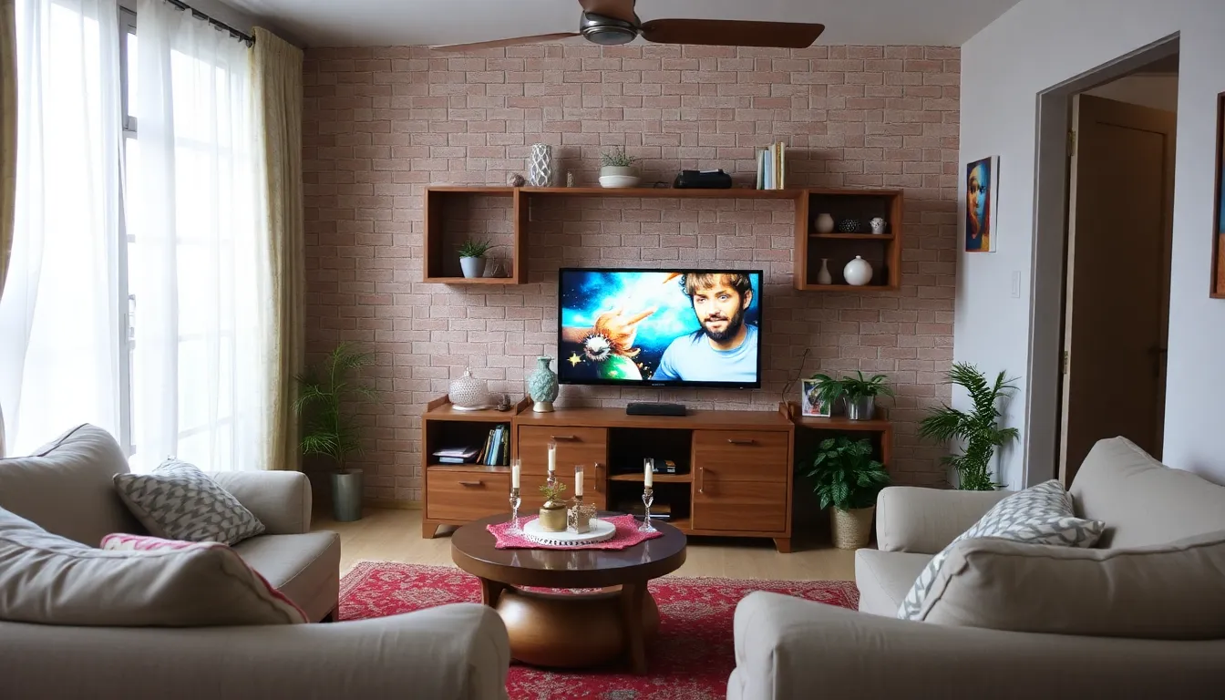 - Combinación de texturas: Un televisor enmarcado con madera reciclada, rodeado de plantas verdes, que aporta un toque natural y fresco al espacio.
